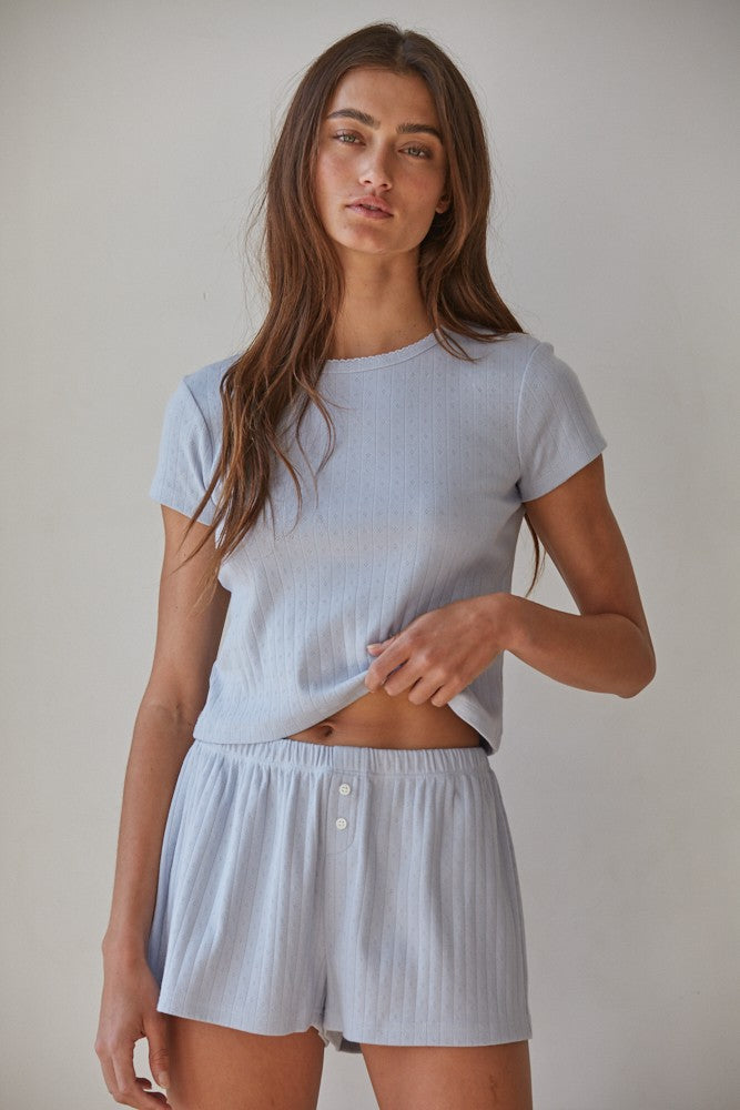 Knit Polyester Rayon Spandex Pointelle Ribbed Round Neck Short Sleeve