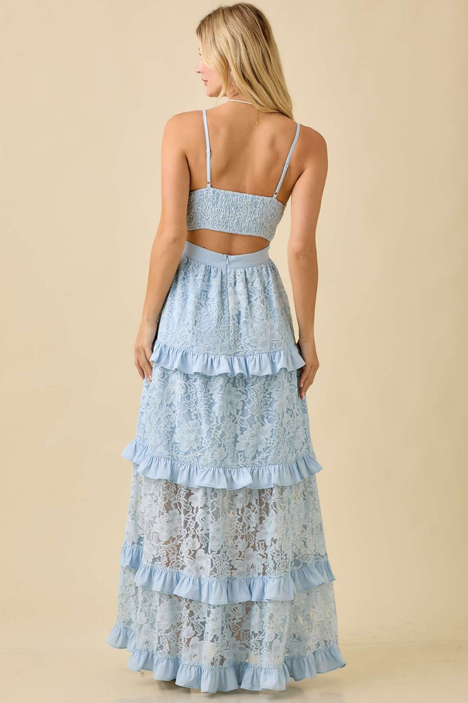 Romantic and graceful, this lace maxi dress features cascading ruffle tiers and a bold center thigh slit for added movement and allure. Perfect for special occasions, weddings, or elegant summer nights.