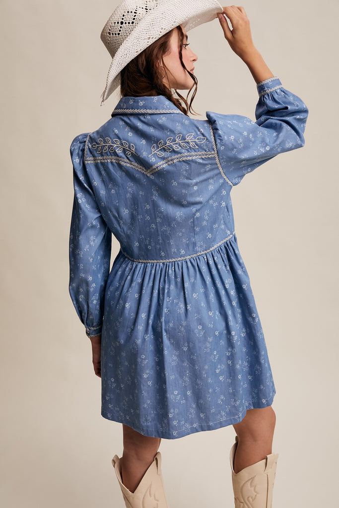 waist seam - Collar: Classic pointed shirt collar with embroidered trim - Sleeves: Long puff sleeves with buttoned cuffs and matching trim - Functional Feature: Side seam pockets for added convenience - Model is 5' 7" 30-24-35 and wearing a size Small A playful nod to prairie-western charm, this shirt dress blends