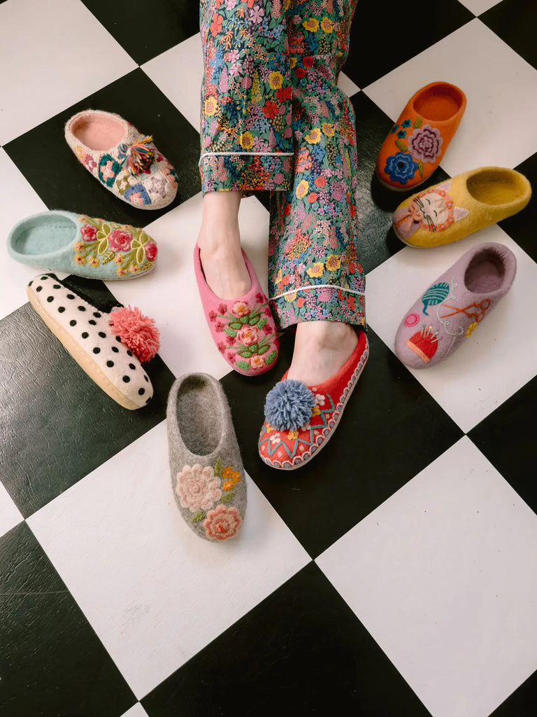 Keep your feet warm and snug while you create with our hand-felted Crafting Slippers. Made from 100% wool and rubber soles, these unique slippers are sure to add a little whimsy to your crafting time.