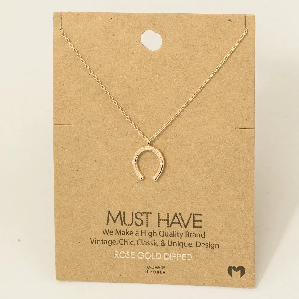 This necklace brings a luxurious gold dipped cubic zirconia western horse shoe pendant style. Immerse yourself in the world of understated glamour as this necklace effortlessly exudes timeless appeal. This necklace approximately measures (Inches): L: 16 MADE IN KOREA 100% BRASS